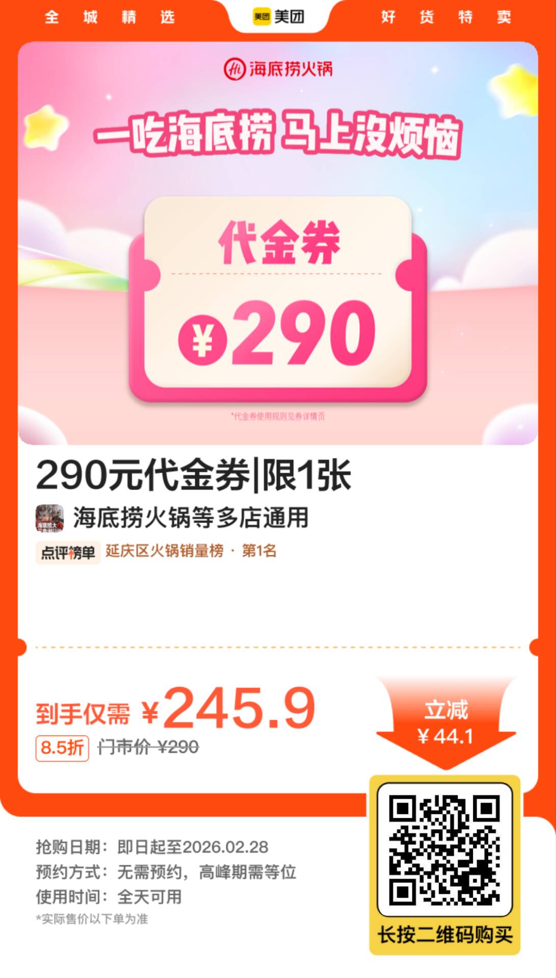 巴奴毛肚火锅100元代金券不限张数多店可用91.8