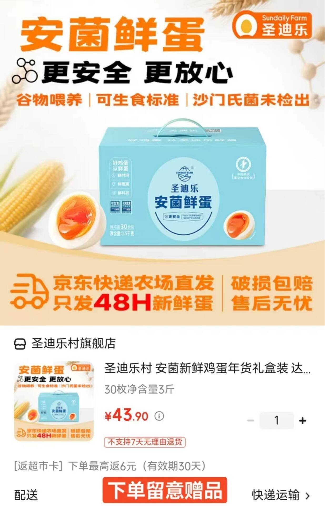 圣迪乐村 可生食鲜鸡蛋30枚