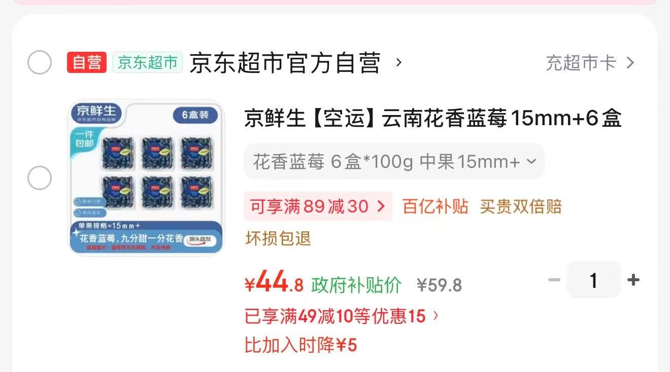 京鲜生【空运】云南花香蓝莓15mm 6盒 100g/盒【44.9】