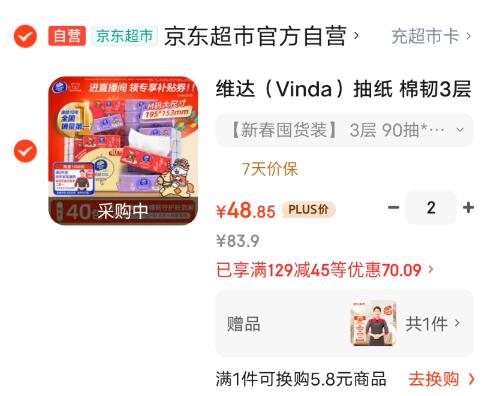 维达 棉韧3层抽纸90抽*40包