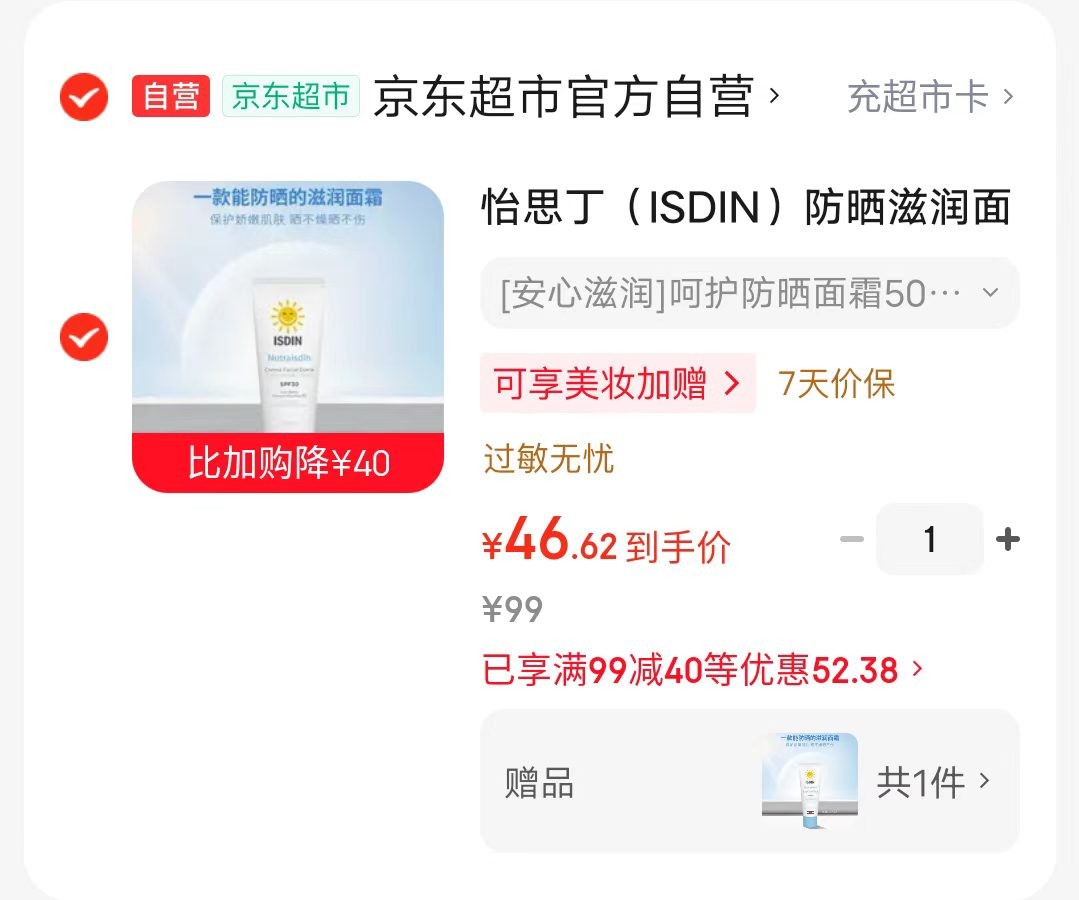 怡思丁 (ISDIN)防晒滋润面霜SPF30 50ml,凑后【46.6】买一送一