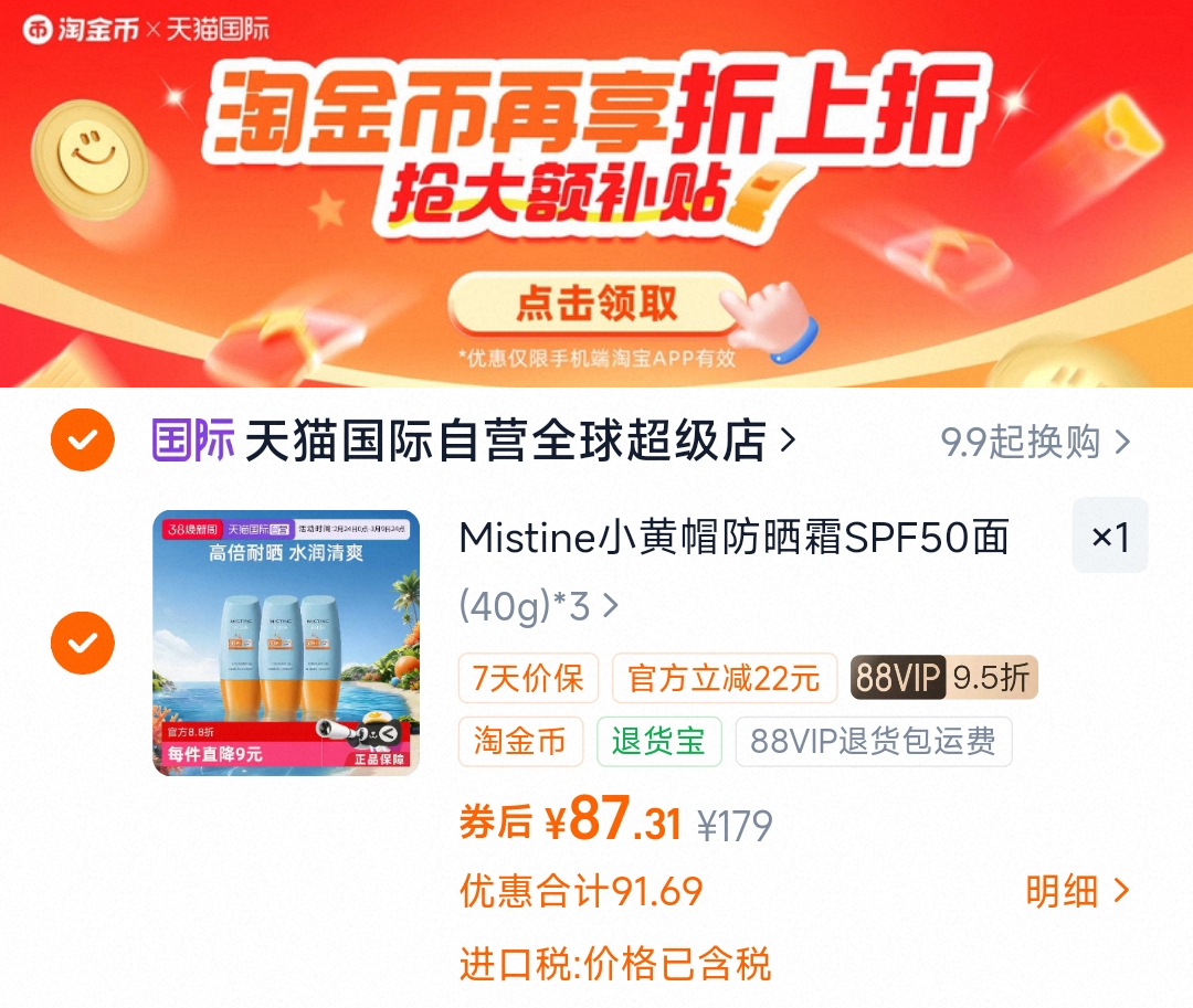 下拉拍,87.3元 折29元/瓶 Mistine蜜丝婷防晒霜40ml*3支