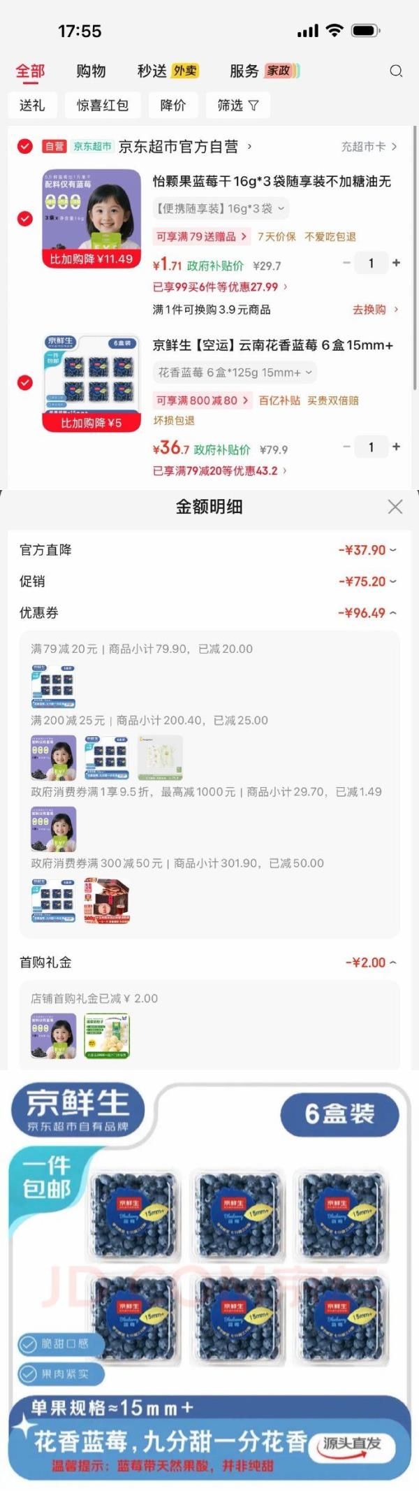 京鲜生 云南花香蓝莓 6盒15mm 125g/盒