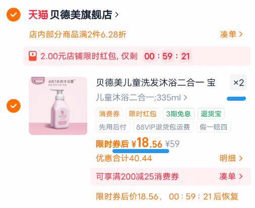 18.5亓/瓶神圿啪2件38亓 叠2亓限时虹包手慢无 贝德美 儿童洗沐二合一335ml*2