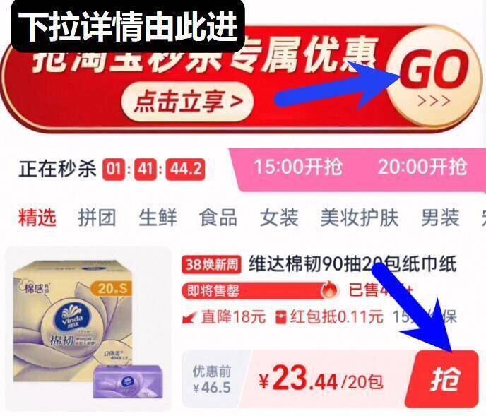 1.1亓/包速拍下23亓 无券下拉详情页去秒杀会场拍下 维达 棉韧抽纸90抽*20包好单发报员2026年03月08日 20:360举报 1.1亓/包速拍下23亓无券下拉详情页去秒杀会场拍下【维达】棉韧抽纸90抽*20包https://m.tb.cn/h.idr29d9复制文案
