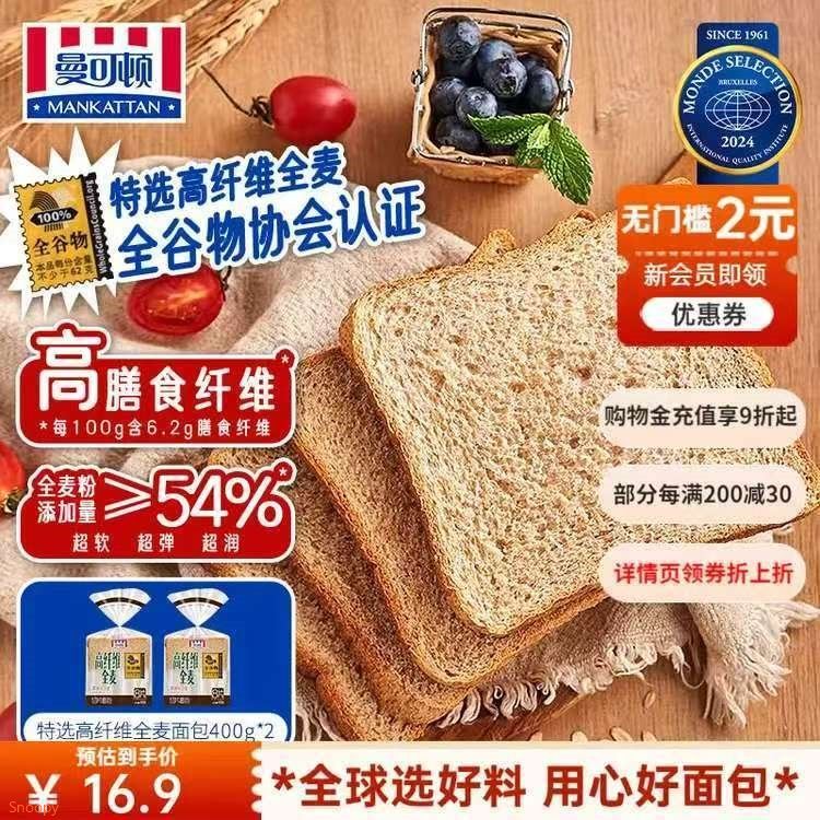 曼可顿 全麦吐司面包400g*2袋