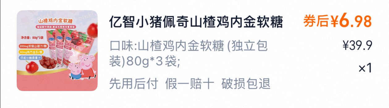 亿智 小猪佩奇山楂鸡内金软糖80g*3包 弹李金