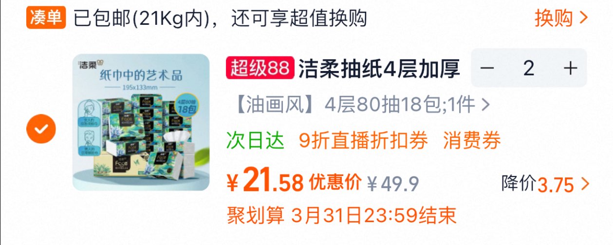 洁柔抽纸油画风80抽18包选项,领李金
