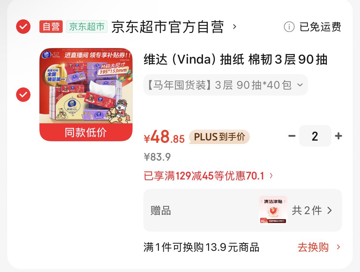 维达立体美90抽*40包M码 Plus拍2件叠97.7元 赠20元津贴