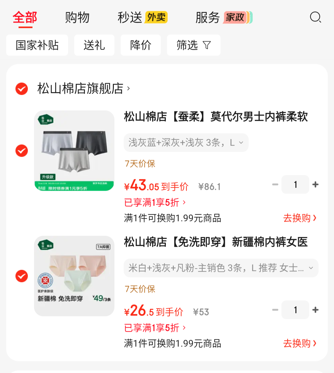 松山棉店 蚕柔莫代尔男士内裤10A抑菌 3条【43】