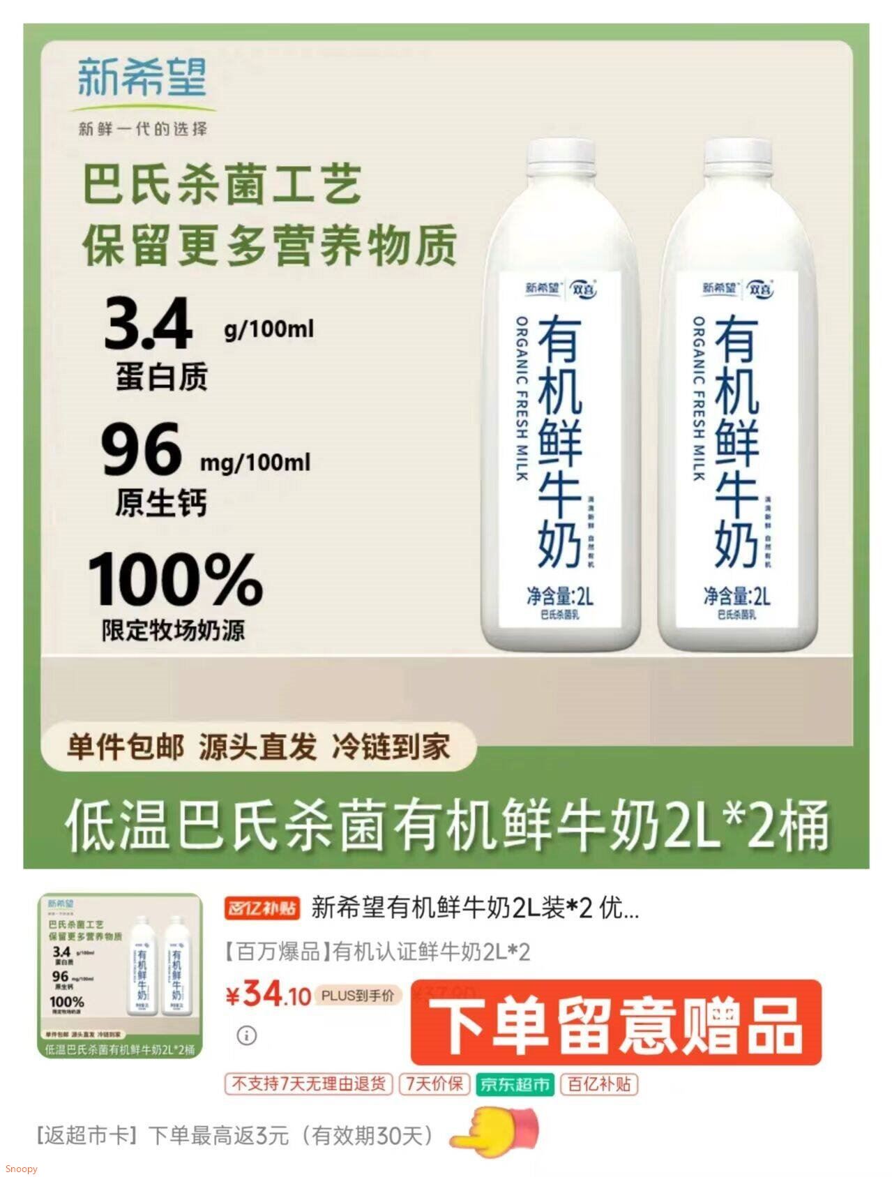 新希望 有机鲜牛奶2L*2瓶 37.9元自营包U Plus34.1好单发报员2026年03月23日 09:430举报 ——新希望鲜奶发車——新希望 有机鲜牛奶2L*2瓶https://u.jd.com/c1q7KGZ37.9元自营包U,Plus34.1*反3元超市卡 折15.5元/瓶复制文案