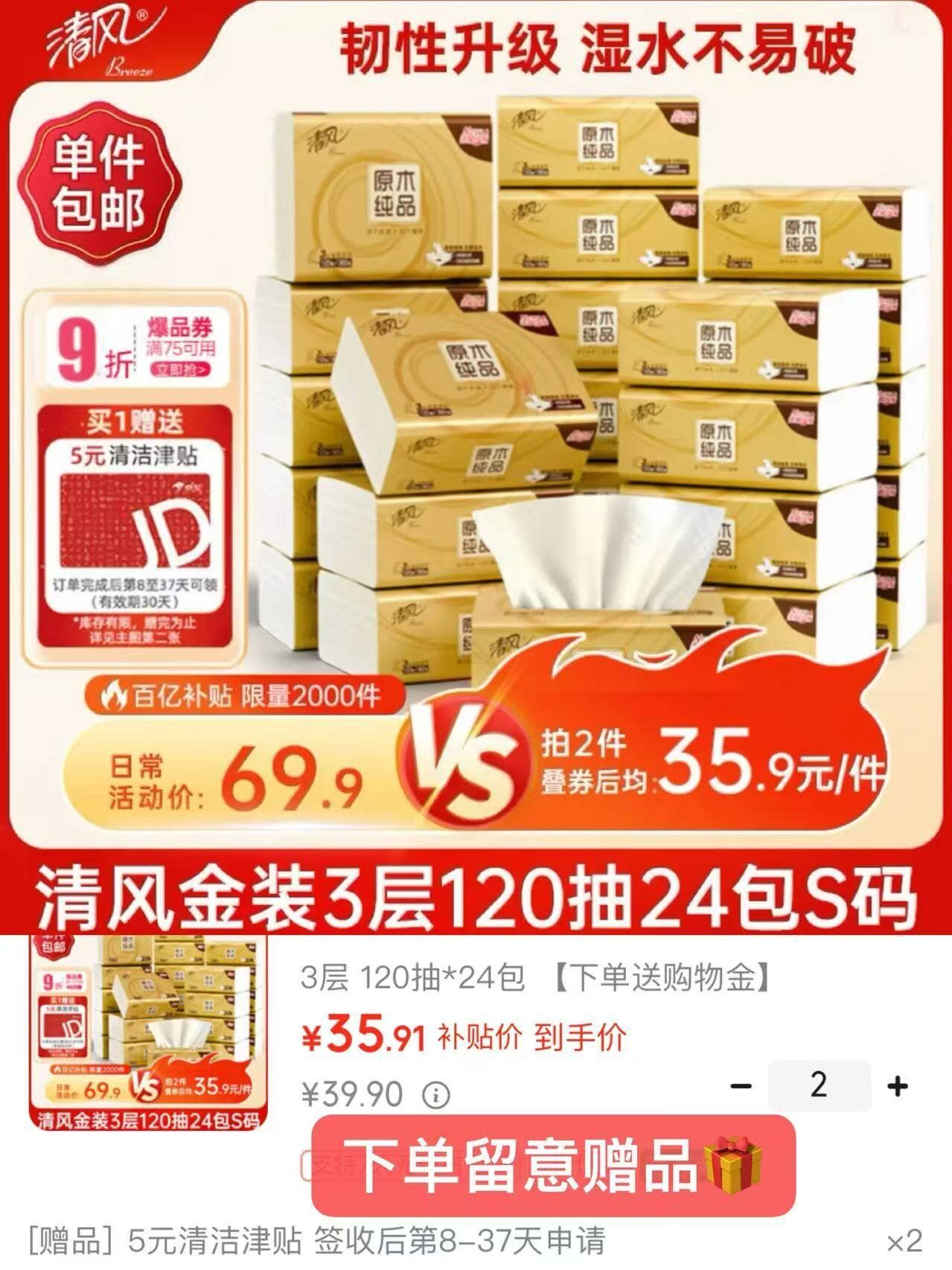 自营 金装抽纸120抽*24包 买2件71.8元 贈10元津贴 好单发报员 2026年03月23日 14:02 0 举报 ——清风抽纸发車——【自营】金装抽纸120抽*24包https://u.jd.com/c6zlLzX买2件71.8元,贈10元津贴*7天后兑换成E卡 才折1.2/包 复制文案