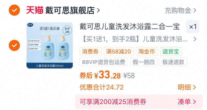 16.6/瓶 戴可思儿童洗沐二合一 350ml*2瓶33.2元 自动叠琻币好单发报员2026年03月23日 14:400举报 16.6/瓶 戴可思儿童洗沐二合一350ml*2瓶33.2元 自动叠琻币https://m.tb.cn/h.ihQdCBn低泡温和不辣眼 燕麦香好闻母婴级洗护合一 线下一瓶78复制文案