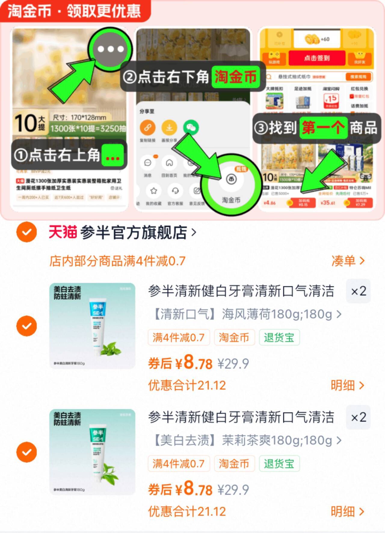8.7/支参半健白牙膏180g 如图叠琻币 任4件35元元 大支装的好单发报员2026年03月23日 20:490举报 8.7/支参半健白牙膏180g如图叠琻币 任4件35元元大支装的!超市一支要20https://m.tb.cn/h.ihcA0BH复制文案