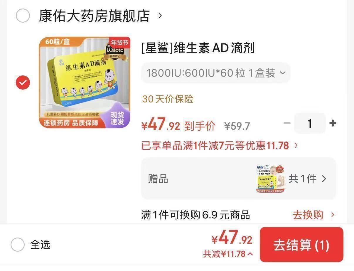 0.39元粒 拍1赠1共2盒47.92元 星鲨 维生素AD滴剂60粒好单发报员2026年03月23日 21:460举报 0.39元粒!拍1赠1共2盒47.92元!星鲨 维生素AD滴剂60粒https://u.jd.com/c68F9U9到手共120粒 OTC版本药房发货 好价可囤复制文案