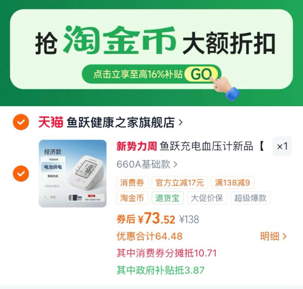速鱼跃电子血压计测量仪 标题下領國布 下拉 88vlp好单发报员2026年03月24日 10:260举报 速鱼跃电子血压计测量仪标题下領國布 下拉 88vlp拍660A基础歀73.5元元-----1下拉叠琻币加车一件叠88vlp200-25消废奍https://m.tb.cn/h.i7VLEAc复制文案