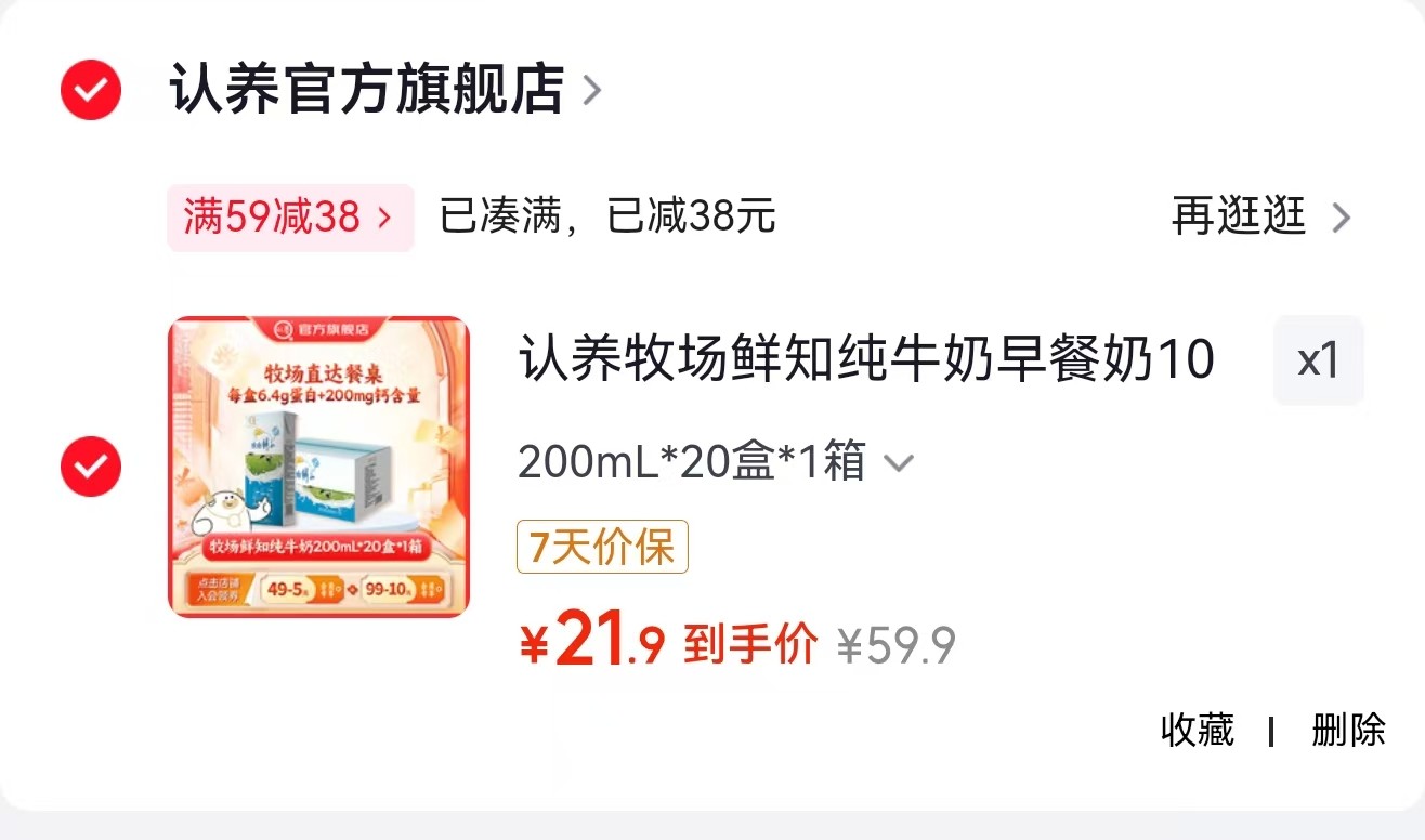 认养 牧场鲜知纯牛奶早餐奶 200mL*20盒【21.9】