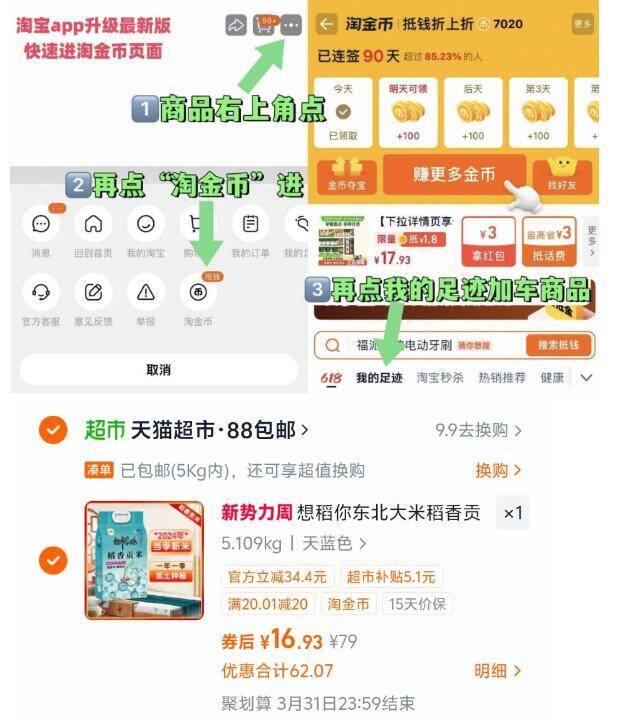 速1.6/斤大米 好圿冲 想稻你稻香贡米10斤16.9元 ①如图点右上角3个点好单发报员2026年03月24日 10:560举报 速1.6/斤大米 好圿冲想稻你稻香贡米10斤16.9元①如图点右上角3个点,选淘金币②选我的足迹-找到商品拍下https://m.tb.cn/h.i7f5RiM复制文案