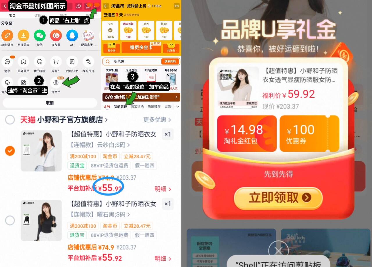 55.9元神圿叠礼金 淘金币 小野和子 夏款透气防晒衣 ①如图点右上角3个点好单发报员2026年03月24日 11:080举报 55.9元神圿叠礼金 4淘金币【小野和子】夏款透气防晒衣①如图点右上角3个点,选淘金币②选我的足迹-找到商品拍下https://m.tb.cn/h.iSWewl9复制文案