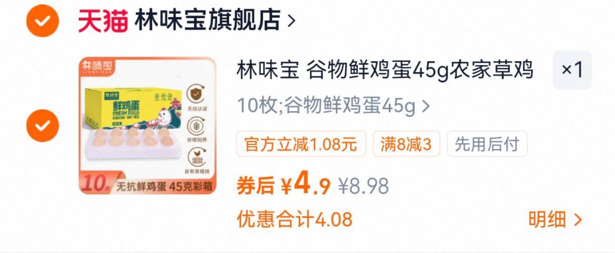 林味宝 谷物鲜鸡蛋45g 10枚珍珠棉礼盒装4.9元 农家草鸡蛋口感细腻鲜香 好单发报员 2026年03月24日 12:08 0 举报 林味宝 谷物鲜鸡蛋45g10枚珍珠棉礼盒装4.9元农家草鸡蛋口感细腻鲜香~https://m.tb.cn/h.ih0qQKp 复制文案