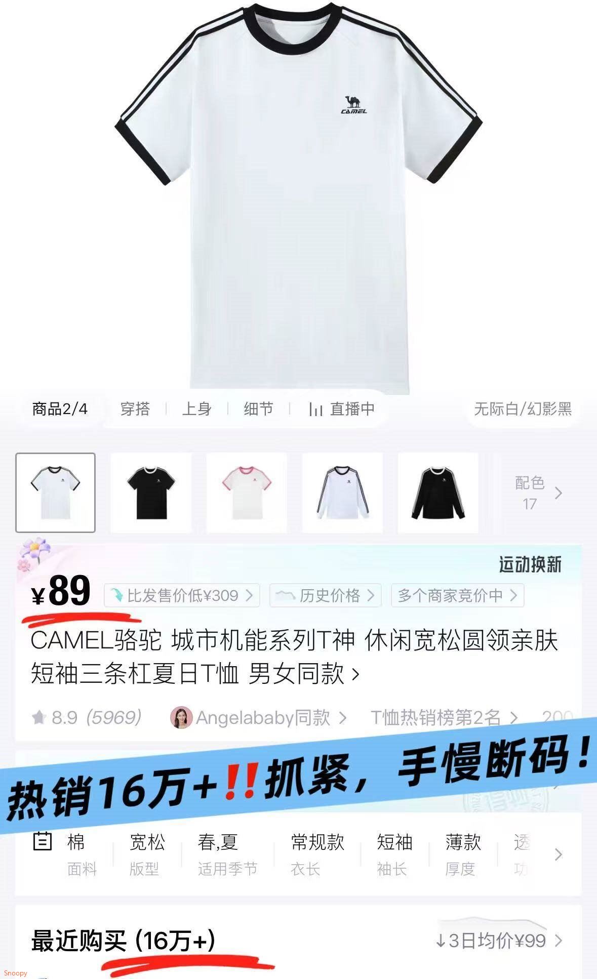骆驼 男女纯棉三条纹短袖T恤