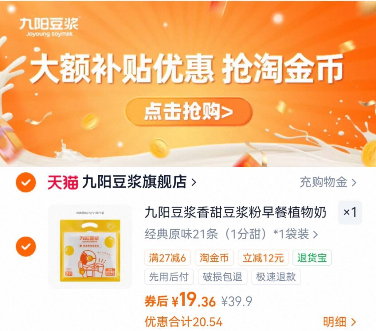 九阳原味豆浆粉21条/袋 下拉详情页到手19.3元 元 豆浆还得九阳 好单发报员 2026年03月24日 13:09 0 举报 九阳原味豆浆粉21条/袋下拉详情页到手19.3元 元豆浆还得九阳!蛋白质含量高https://m.tb.cn/h.iSfS3MO 复制文案