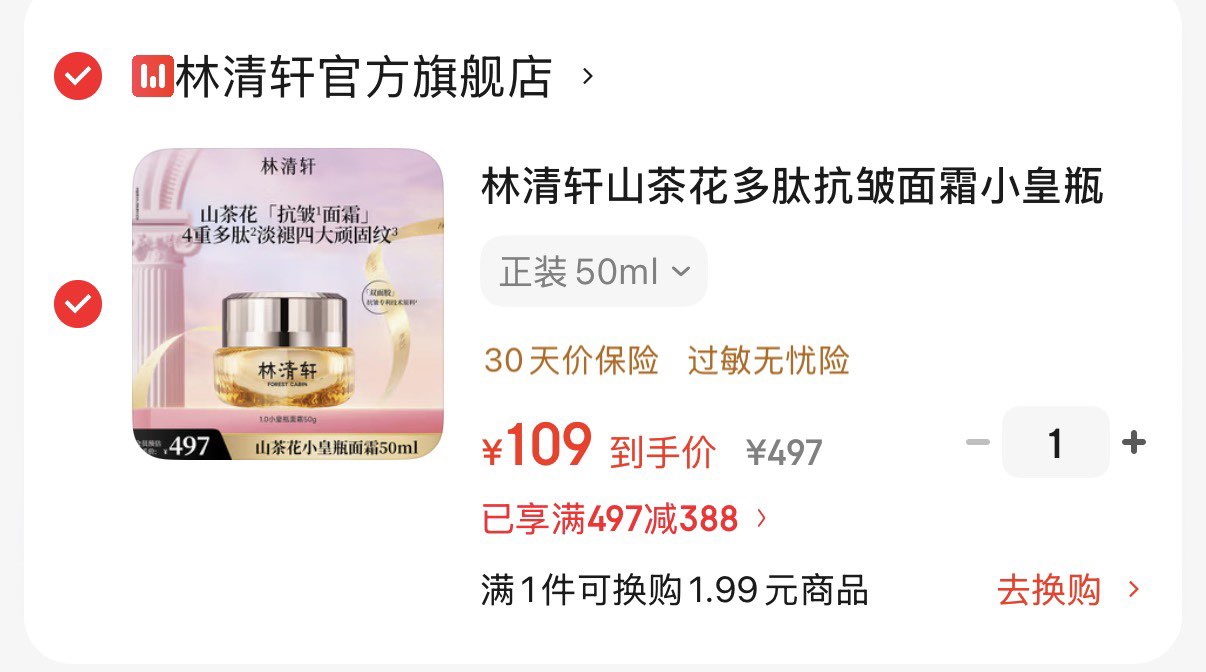 林清轩山茶花多肽抗皱面霜 拍下109元 50ml正装好单发报员2026年03月24日 17:250举报 林清轩山茶花多肽抗皱面霜拍下109元 50ml正装https://u.jd.com/cgO0qAD复制文案