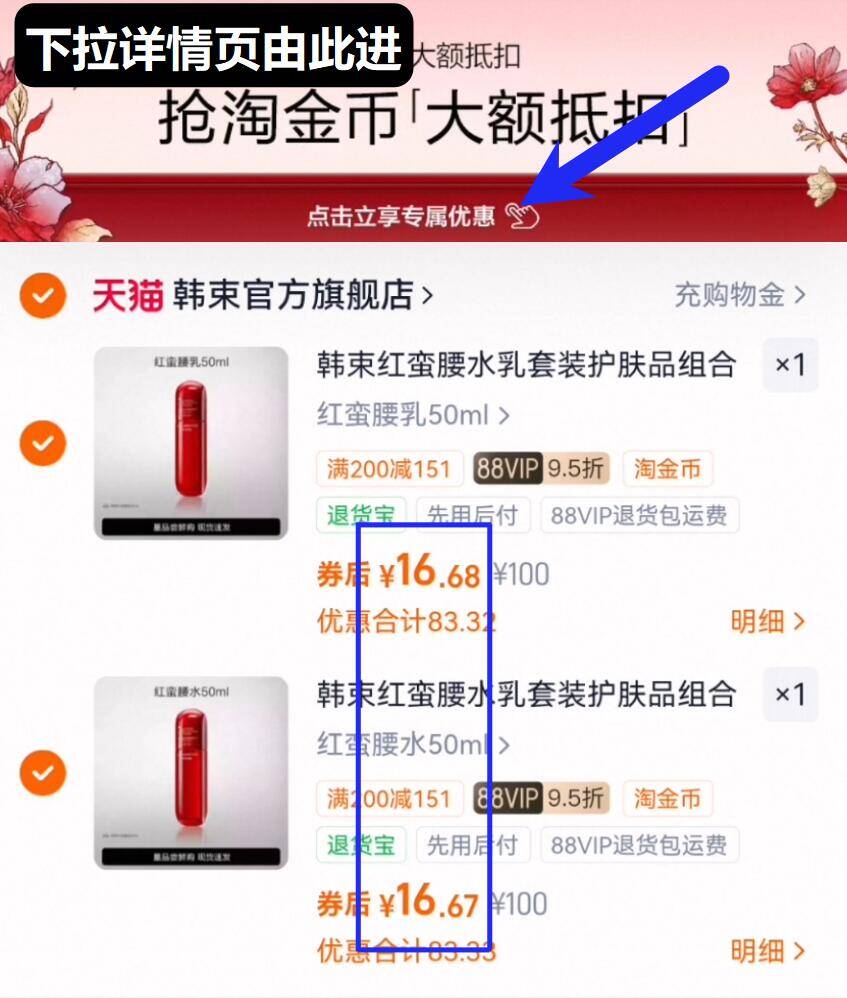韩束红蛮腰水乳洁面任选 33.3元好单发报员2026年03月24日 22:240举报 88vip16.6元/件神圿叠13淘金币下拉详情页跳转淘金币拍2件33.3元【韩束】红蛮腰水乳洁面任选https://m.tb.cn/h.ihjQvN4复制文案