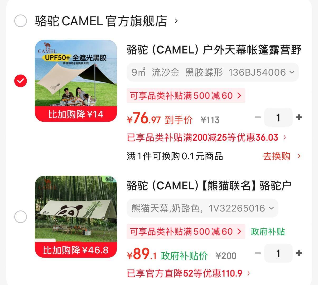 骆驼户外天幕帐篷9㎡ 流沙金 黑胶蝶形 76.9元,骆驼熊猫联名户外天幕帐篷 89元