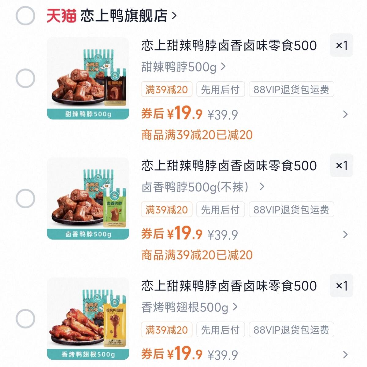 恋上甜辣卤香鸭脖500g 19.9元