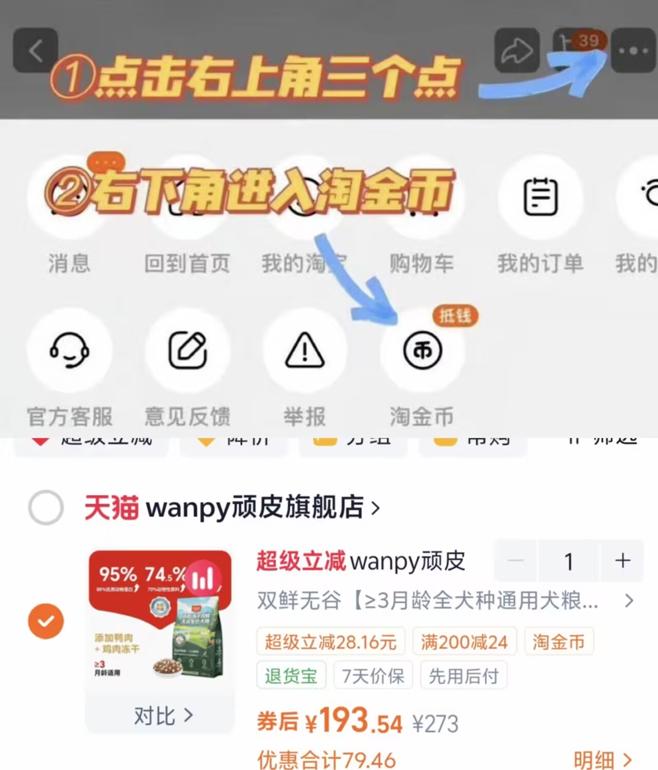 右上角[ ]-点"淘金币