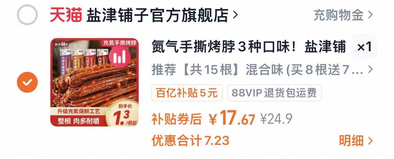 盐津铺子充氮手撕烤脖15根 17.6元 好单发报员 2026年04月01日 11:13 0 举报 盐津铺子充氮手撕烤脖15根按图叠琻币17.6元折1.1/根https://m.tb.cn/h.iQ0S5aN整根的长长脖 啃得超级过瘾肉质紧实有嚼劲不会干巴 复制文案