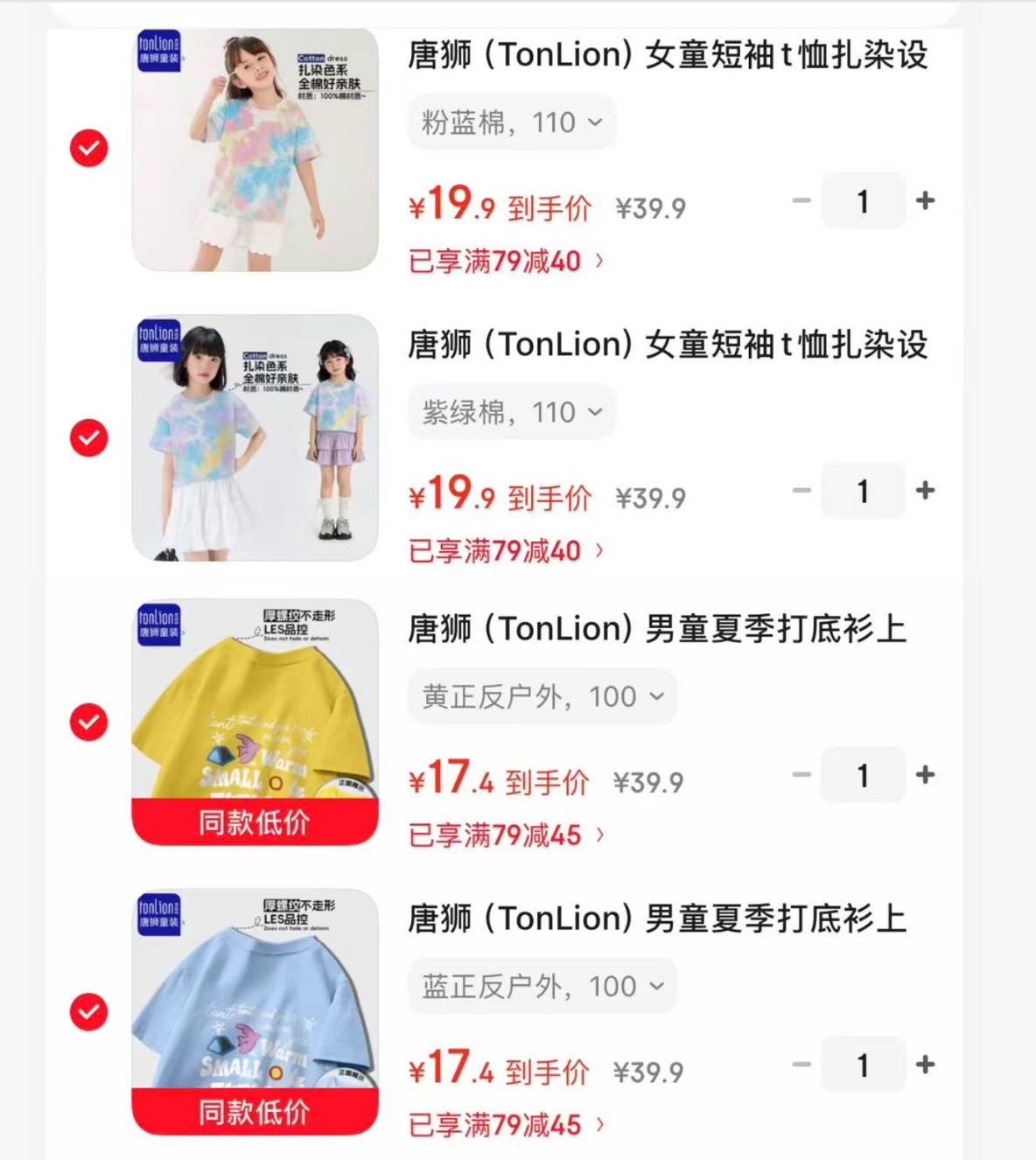唐狮(TonLion)女童短袖t恤扎染设计,任选2件 【34.8】