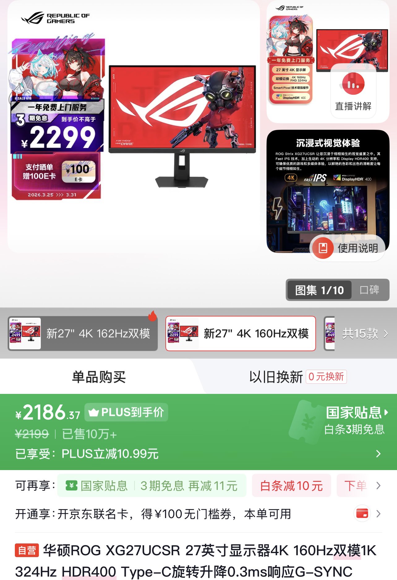 华硕 ROG XG27UCSR 27英寸显示器【2086】含晒返100(4K 160Hz 1k好单发报员2026年04月01日 21:470举报 华硕 ROG XG27UCSR 27英寸显示器【2086】含晒返100(4K 160Hz 1k 324hz)https://u.jd.com/c1RohDb复制文案