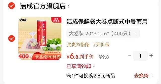 洁成保鲜袋大卷装30cm*20cm*400只 6.8元 好单发报员 2026年04月02日 08:25 0 举报 6.8元包邮!洁成 保鲜袋大卷装 30cm*20cm*400只https://u.jd.com/cO7H44n 点断式 加厚材质不易破~ 复制文案