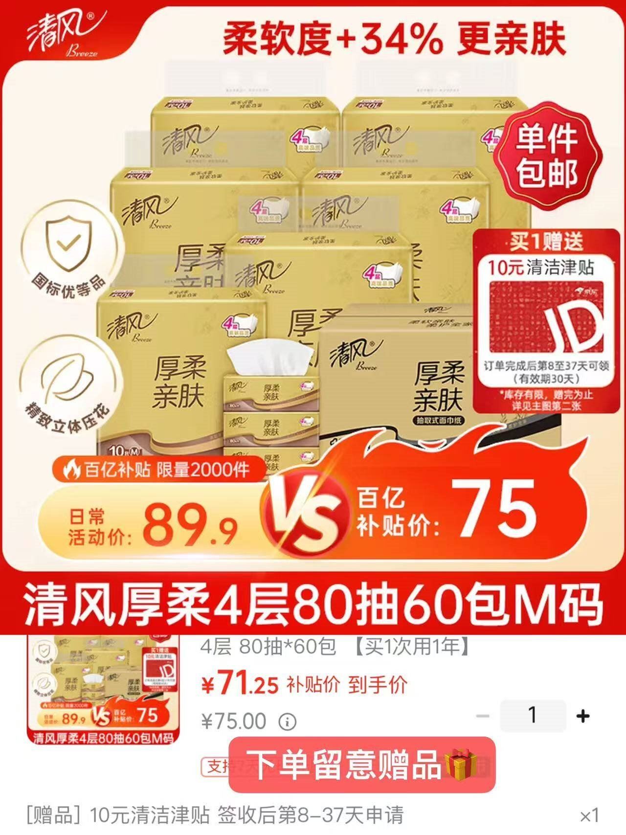 清风4层抽纸M码80抽*60包 75元好单发报员2026年04月02日 11:320举报 ——清风M码抽纸发車——清风 4层抽纸M码80抽*60包https://u.jd.com/cgVp3M5 75元自营包U,Plus71.2元*新客减3元 贈10元购物津贴*7天后兑换成E卡 仅0.9元/包复制文案