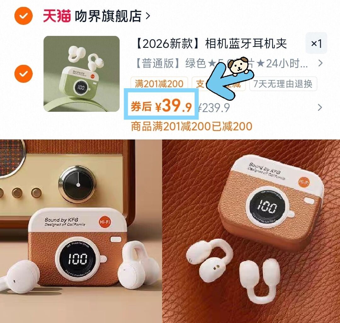 相机蓝牙耳机顶配夹耳式 39.9元 好单发报员 2026年04月02日 13:02 0 举报 39.9元快冲 品质非常顶!夹耳朵上没感觉 佩戴舒适---相机蓝牙耳机 顶配夹耳式复制这条信息打开手机陶宝https://m.tb.cn/h.i9nm0rk戴上去巨稳,怎么动都不掉 复制文案