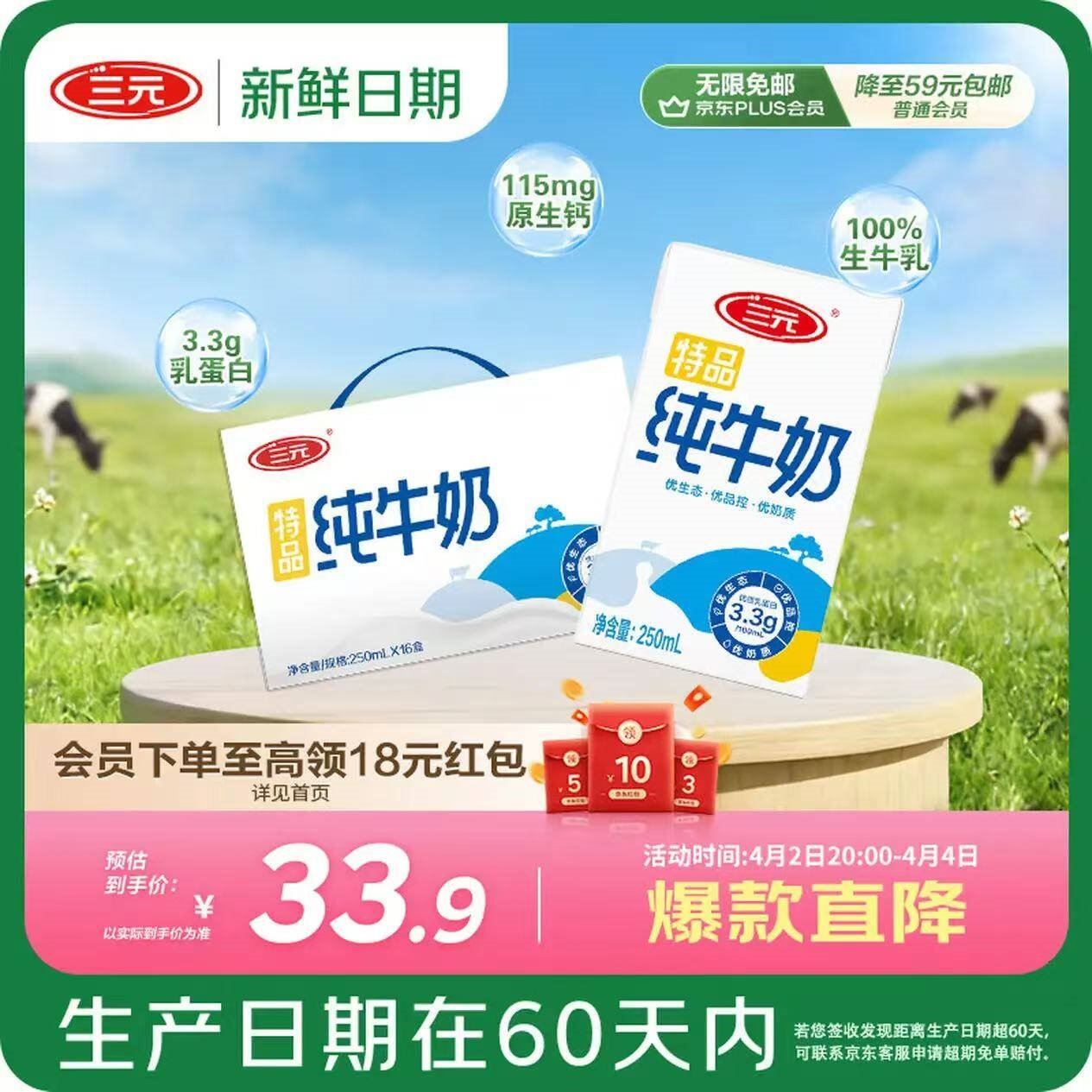 三元特品纯牛奶250ml*16盒 39.9元好单发报员2026年04月03日 08:540举报 ——三元纯奶发車——三元 特品纯牛奶250ml*16盒https://u.jd.com/crUpBVb 39.9元自营包U,新客减2元*北京老牌牛奶 清甜醇香好喝复制文案