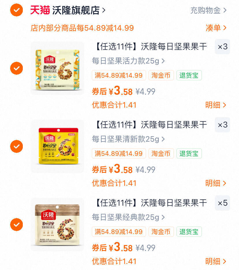 沃隆每日坚果爆款任选拍11件39.3元好单发报员2026年04月03日 10:140举报 速度 沃隆每日坚果爆歀任选拍11件39.3元 3.5元/件打开满满都是坚果的自然香 https://m.tb.cn/h.i9YF7k3复制文案