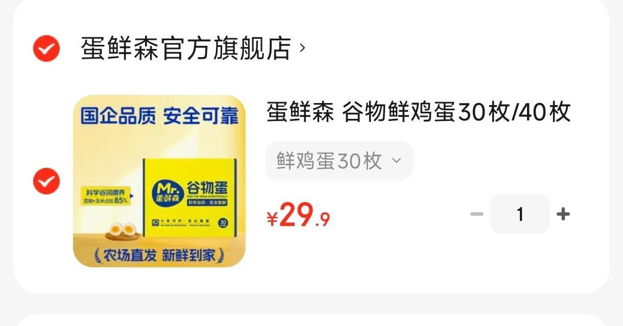 蛋鲜森谷物鲜鸡蛋礼盒装30枚 29.9元好单发报员2026年04月03日 16:400举报 蛋鲜森 谷物鲜鸡蛋礼盒装30枚29.9元,折0.99/枚https://u.jd.com/c6xuRXR复制文案