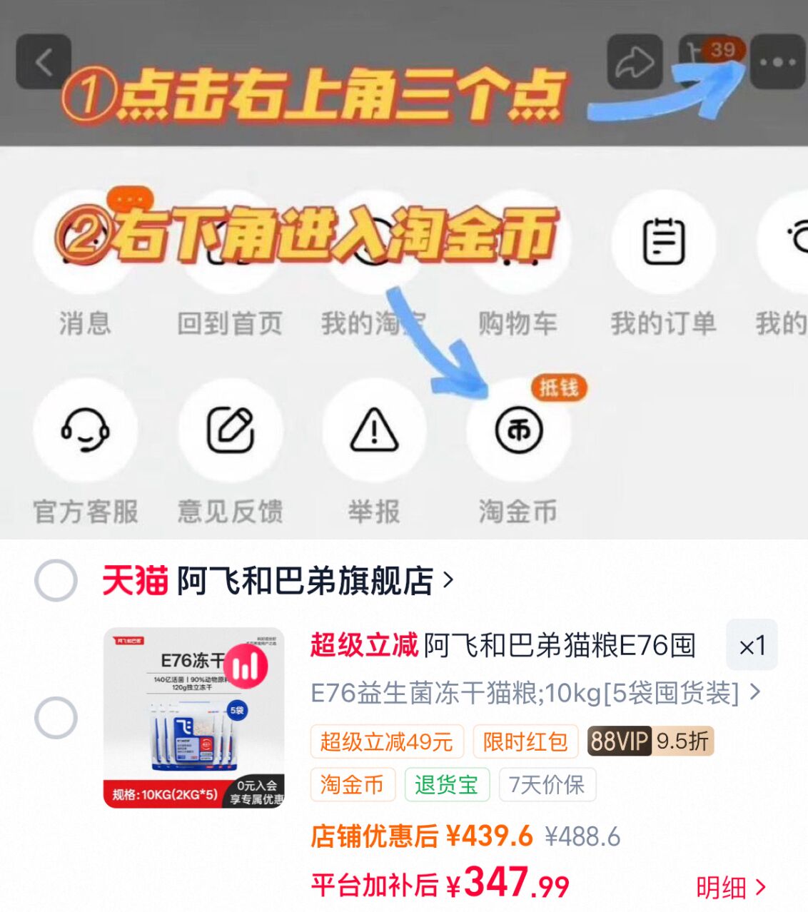 右上角[ ]-点"淘金币