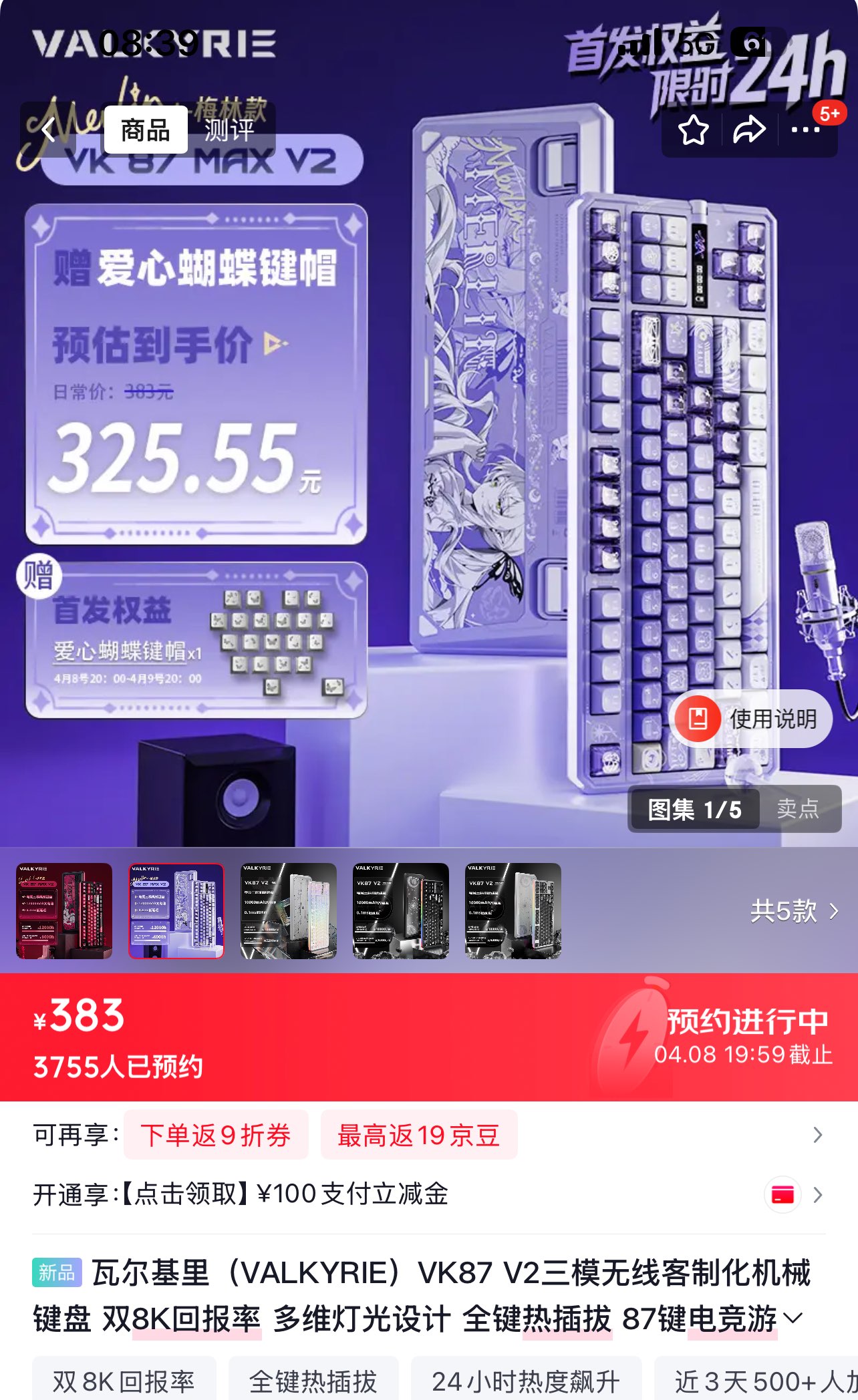 瓦尔基里三模无线客制化机械键盘 4.8元发报员Z2026年04月06日 09:050举报 预约4.8【325】瓦尔基里 三模无线客制化机械键盘 双8K回报率 多维灯光设计 全键热插拔 87键电竞游戏键盘(VK87 MAX V2 MERLIN 梅林款)https://u.jd.com/cghHDYN复制文案