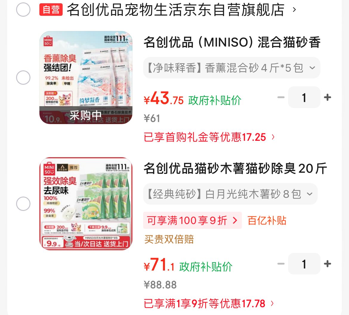 名创优品木薯香氛豆腐混合猫砂2kg*4 43.7元,名创优品白月光纯木薯猫砂1.25kg*8 71元