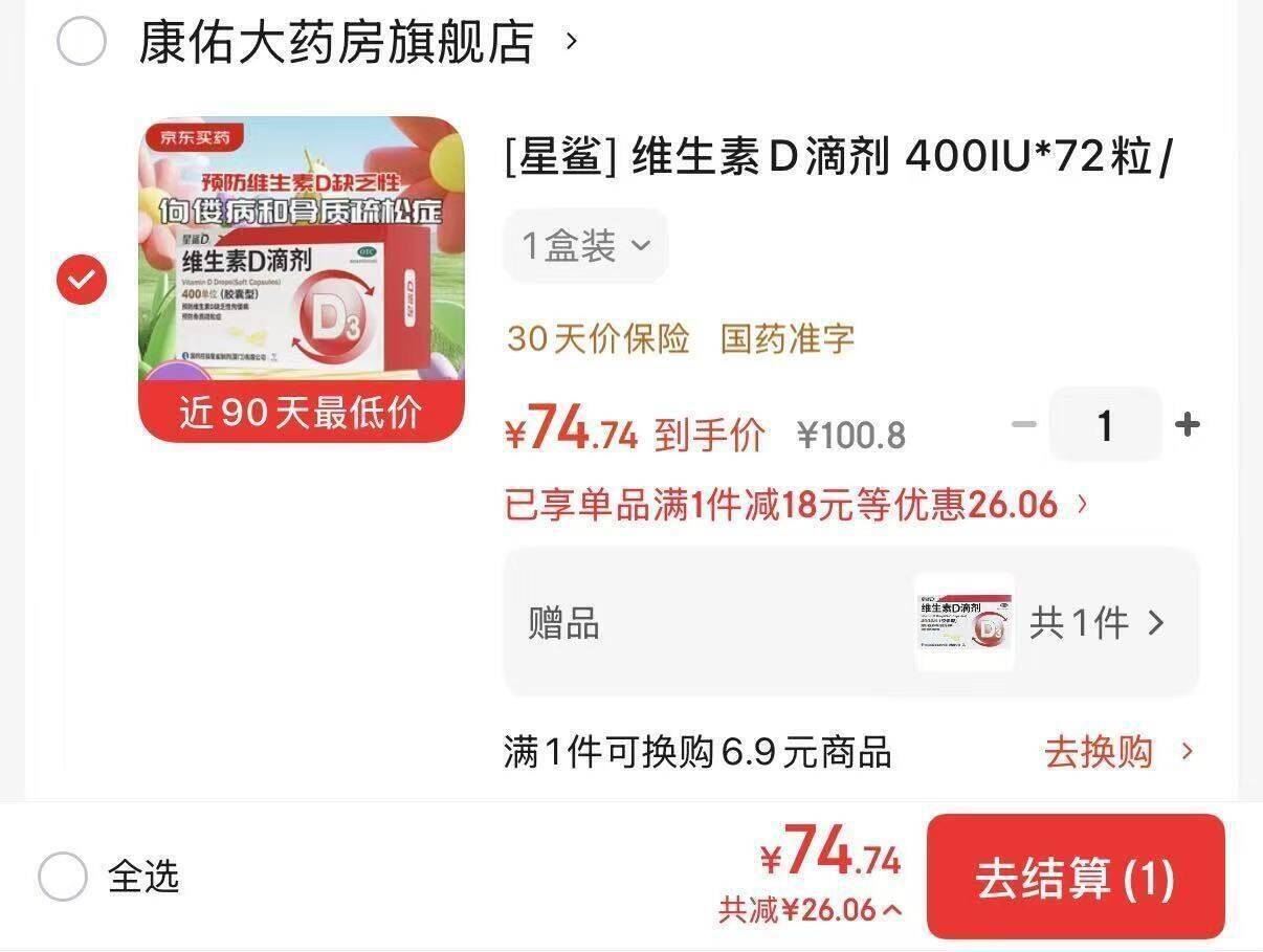 星鲨维生素D3滴剂144粒 74.74元,星鲨维生素D3滴剂72粒 买一赠一共到手2盒 发报员Z 2026年04月06日 15:31 0 举报 74.74元144粒 星鲨好价星鲨 维生素D3滴剂72粒 https://u.jd.com/jOtosv6 买一赠一,共到手2盒OTC版本放心买,孩子每天都要吃 ! 复制文案