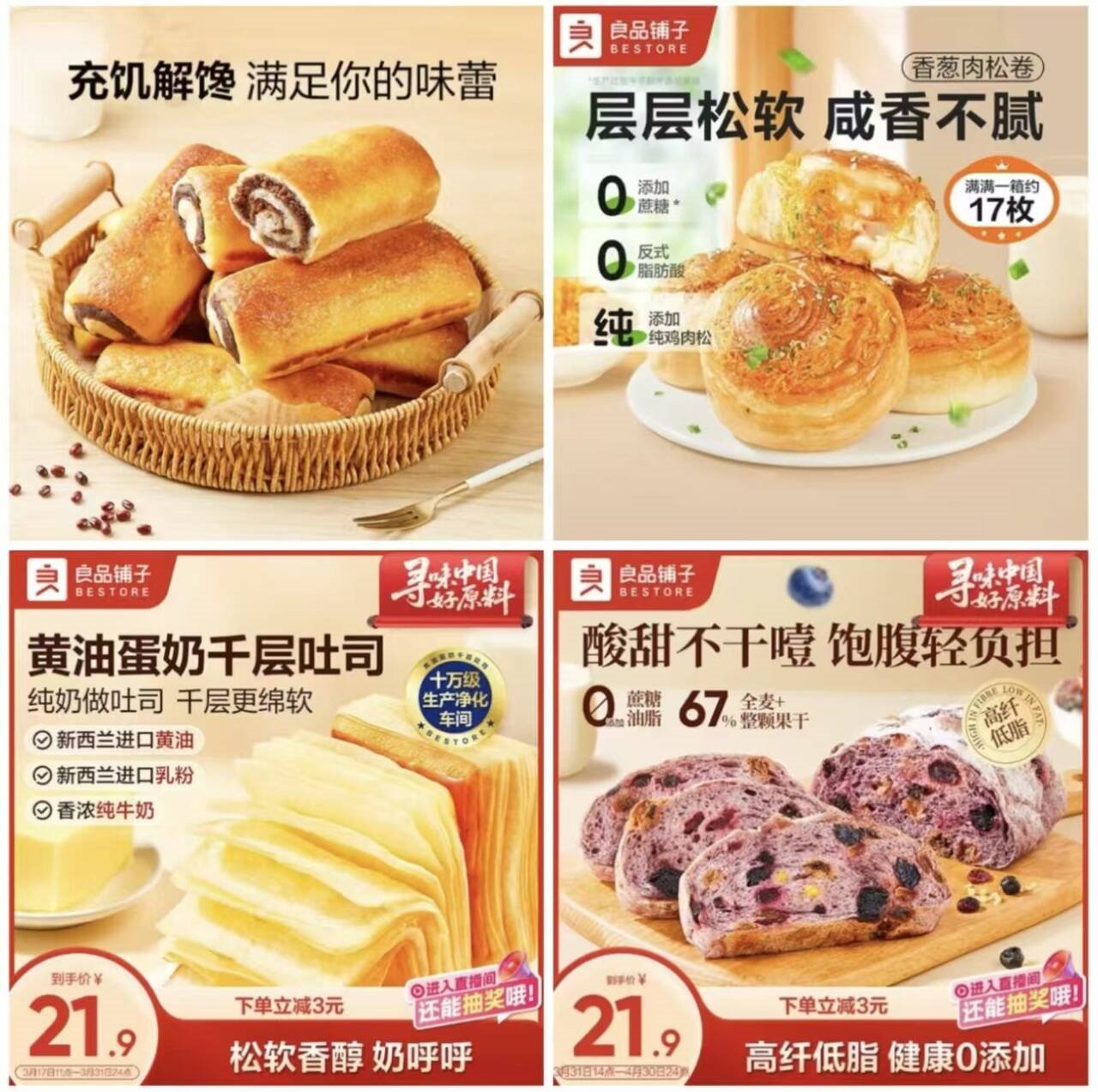 良品铺子全麦红豆沙面包800g 14.9元,良品铺子香葱肉松卷面包800g 15.9元