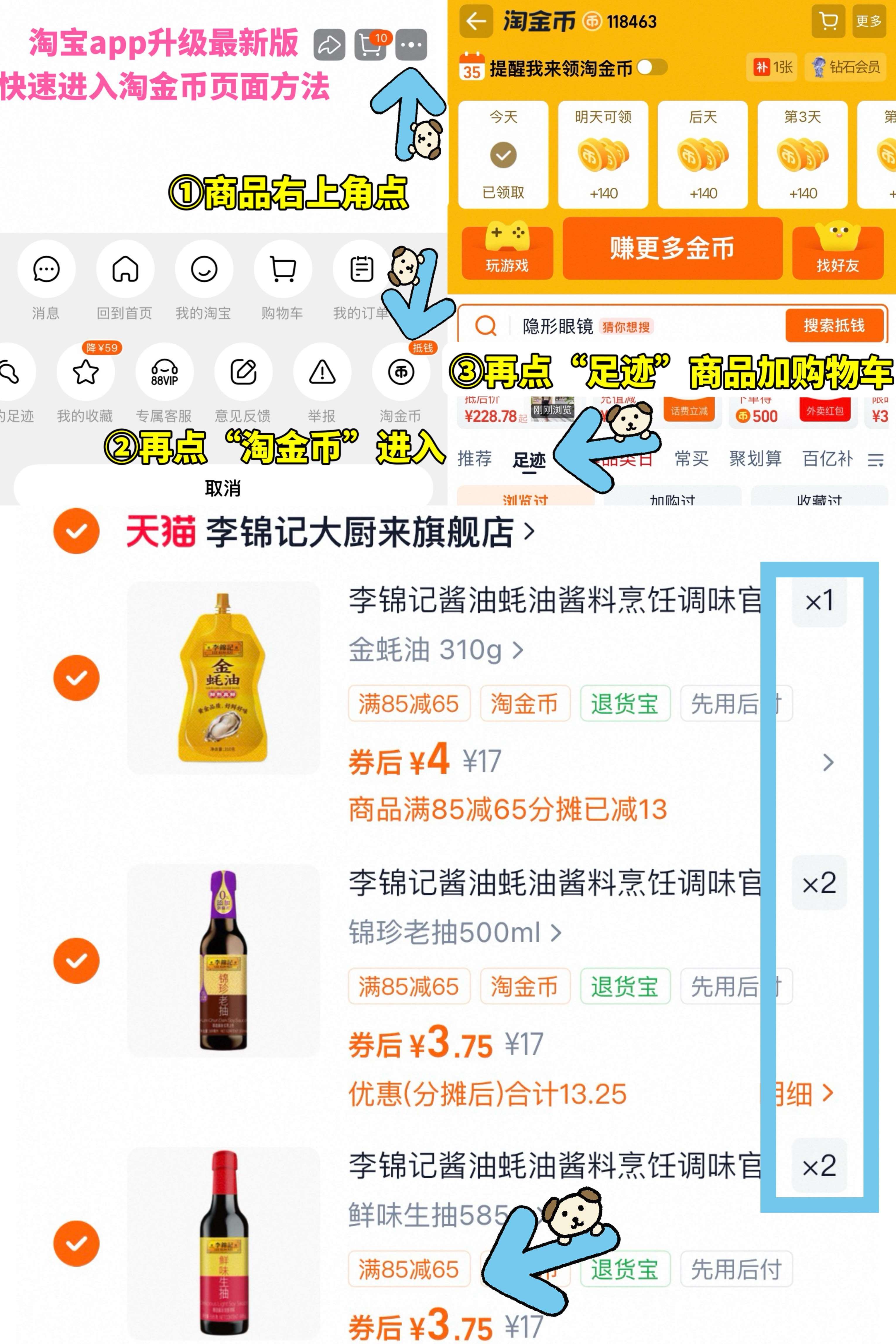 ①如图点右上角3个点,选淘金币