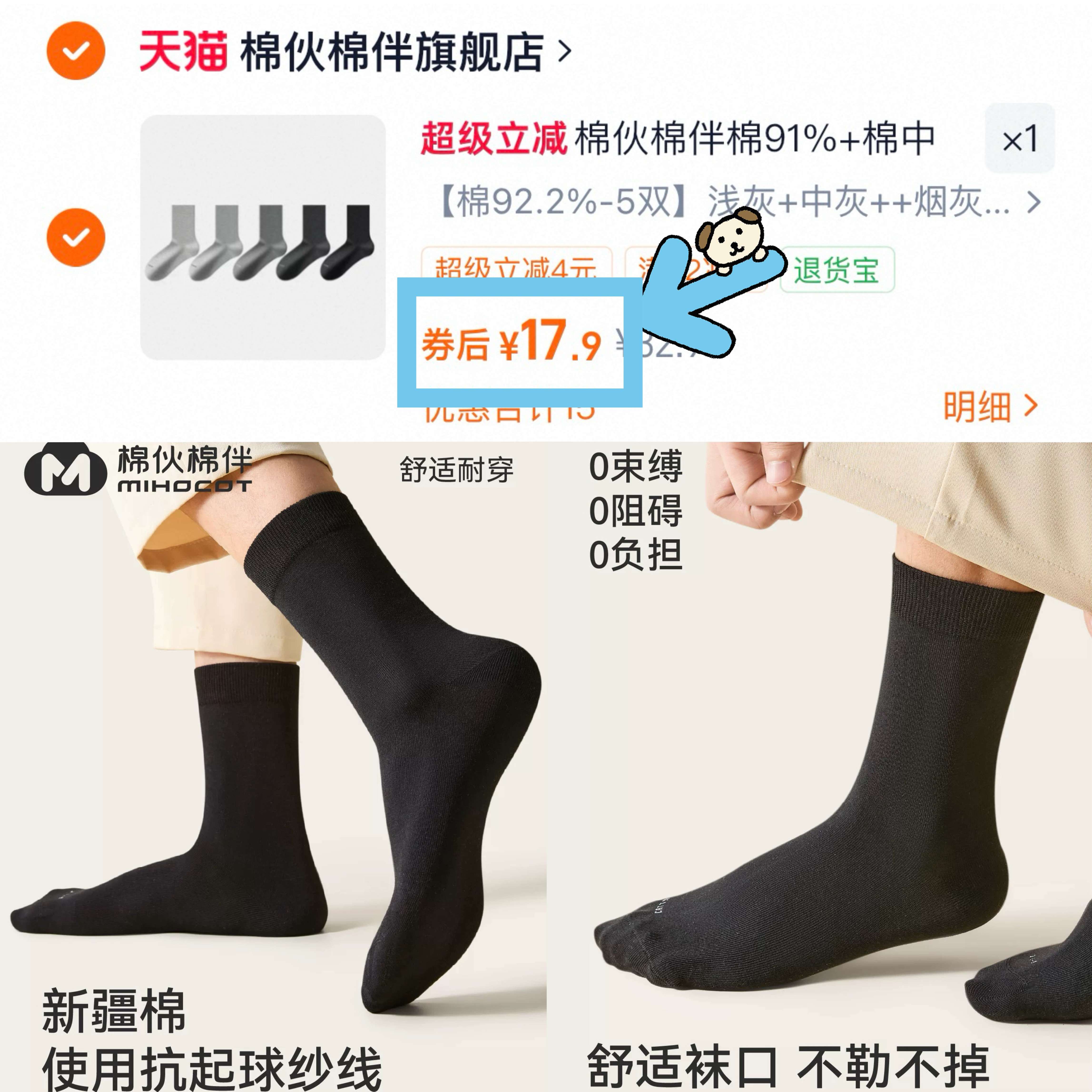 17.9元 到手5双新疆棉袜子