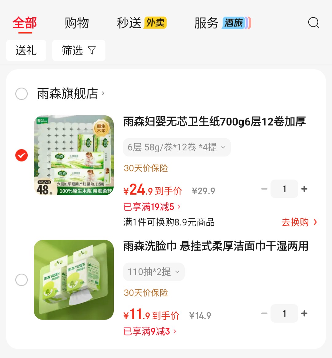 雨森 妇婴无芯卫生纸6层 58g/卷*48卷【24.9】