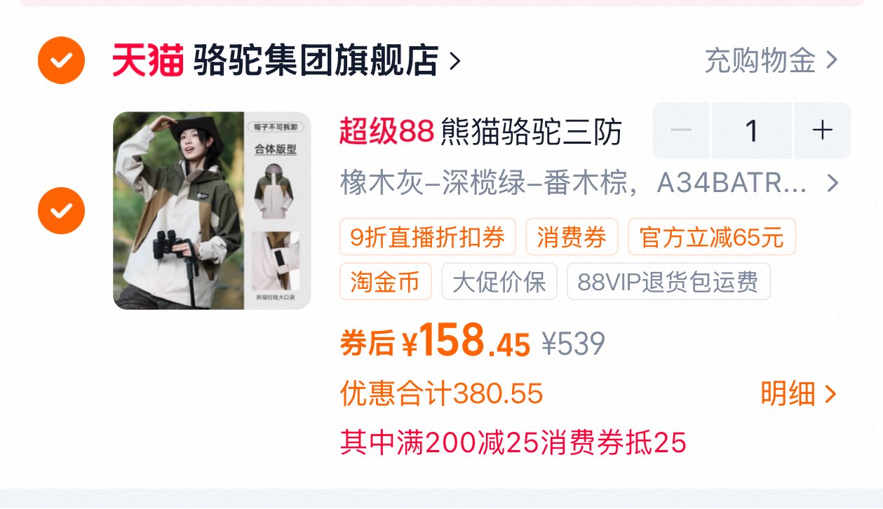 骆驼冲锋衣 158.5元发报员Z2026年04月09日 13:260举报 骆驼冲锋衣主图悬浮窗进zbj弹9折奍加购一件商品右上角...进金币页面再加购够物车数量改1叠200-25消费奍158.5https://m.tb.cn/h.imq0K3p复制文案