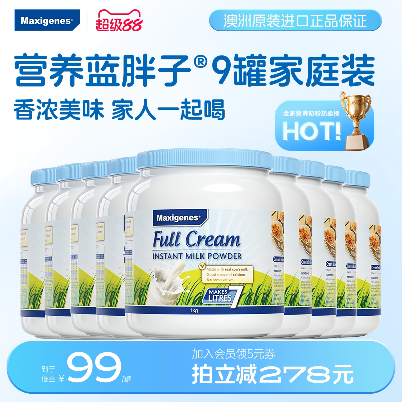 蓝胖子全脂奶粉1kg*9罐装 拍2共18罐 1301.3元